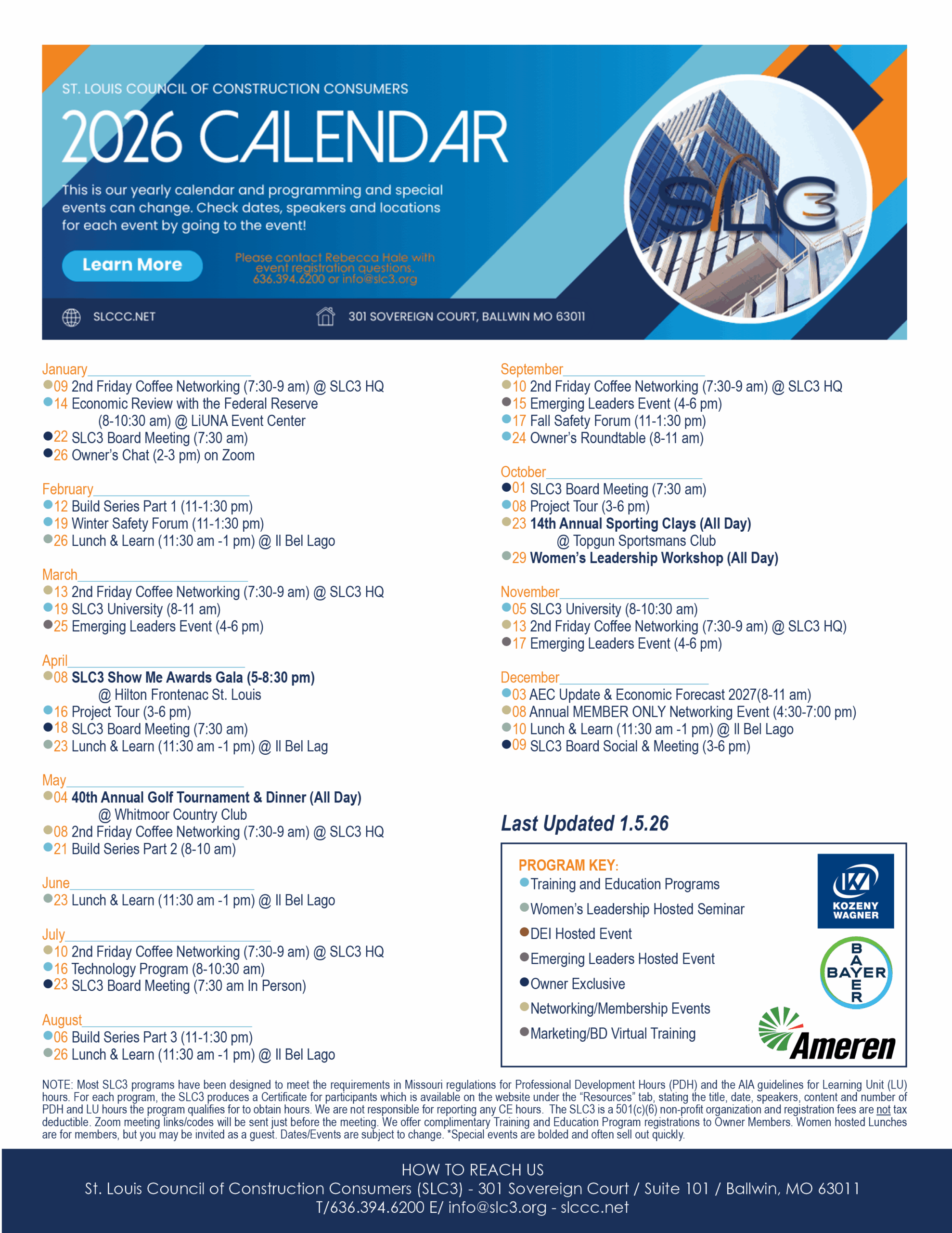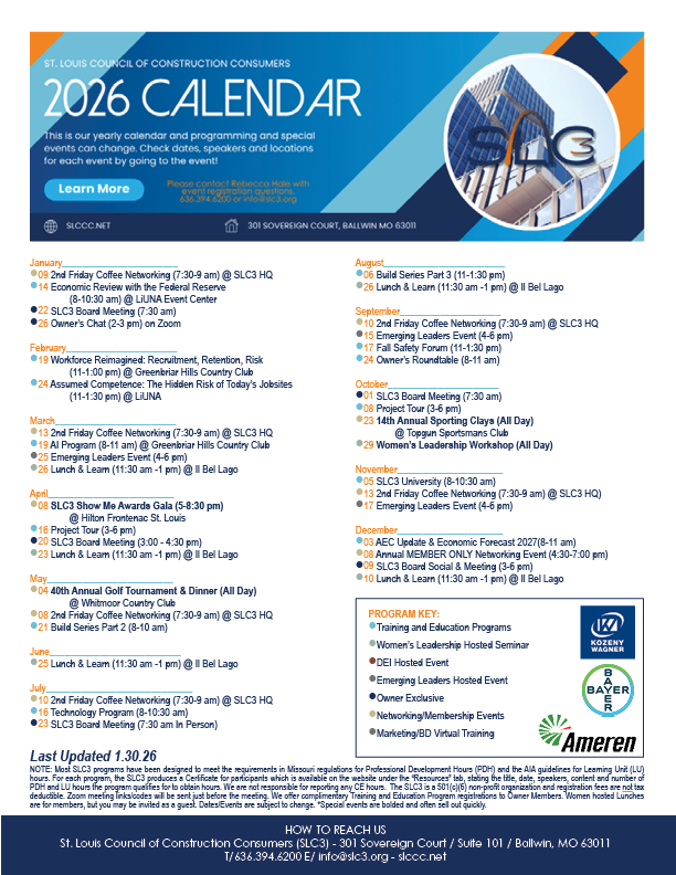 The membership of the SLC3 includes some of the largest construction consumers in the greater St. Louis region. Because of the size and volume of their construction activities, the Council is recognized as the voice of “Owners” in the region. Thus, our voice and impact on construction industry practices is strong and influential. However, we are a community of all stakeholders! We welcome anyone doing business in the natural and built environment. We are truly the ONLY association offering membership bringing together the AEC community in Greater St. Louis and a seat at the table with decision makers! We have multiple levels of membership available – including one that fits your needs!