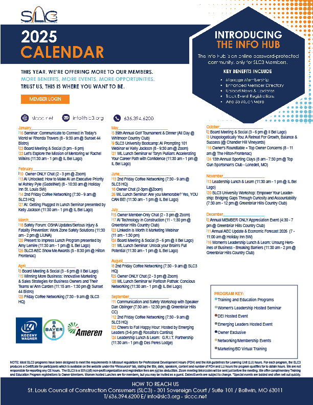 The membership of the SLC3 includes some of the largest construction consumers in the greater St. Louis region. Because of the size and volume of their construction activities, the Council is recognized as the voice of “Owners” in the region. Thus, our voice and impact on construction industry practices is strong and influential. However, we are a community of all stakeholders! We welcome anyone doing business in the natural and built environment. We are truly the ONLY association offering membership bringing together the AEC community in Greater St. Louis and a seat at the table with decision makers! We have multiple levels of membership available – including one that fits your needs!
